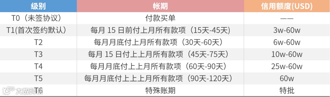 账期最长可达120天,授权额度最高可达600,000USD。