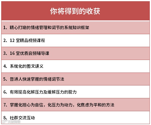 除了12堂视频课程,海蓝及她的教练团队还将用20堂音频辅导课,与你分享真实案例,帮助学员积极应对人生的各个阶段压力、疏解不良情绪。