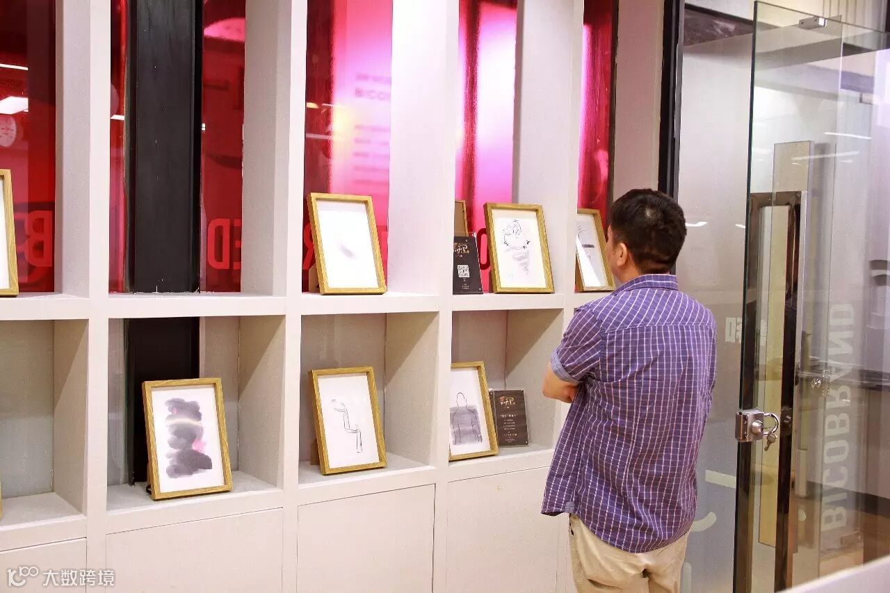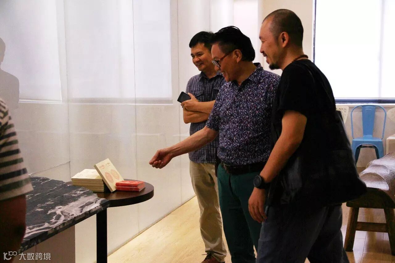 ▲广美城市学院雷小洲副院长起身欣赏集和创始人龚凯绘画作品