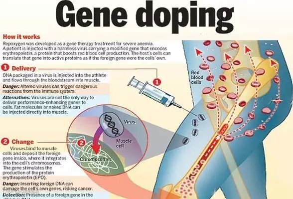 基因兴奋剂?这又是何方妖物?所谓基因兴奋剂,是指不是出于治疗目的,而是利用基因技术相关非正常手段达到提高运动成绩的目的。由于传统兴奋剂现在容易被检出,一些人又开始动起了歪脑筋,他们琢磨着,既然现在基因治疗技术那么发达,如果给运动员体内导入能够产生兴奋物质的外源基因,不但比赛时可以大占便宜,还不易检测出来,岂不是美事一件!举个例子,如果导入促红细胞生成素(EPO)基因,那么即便没有直接服用EPO激素药物,红细胞也能源源不断地大量生成,身体机能可以上一个台阶,拿金牌岂不是探囊取物!