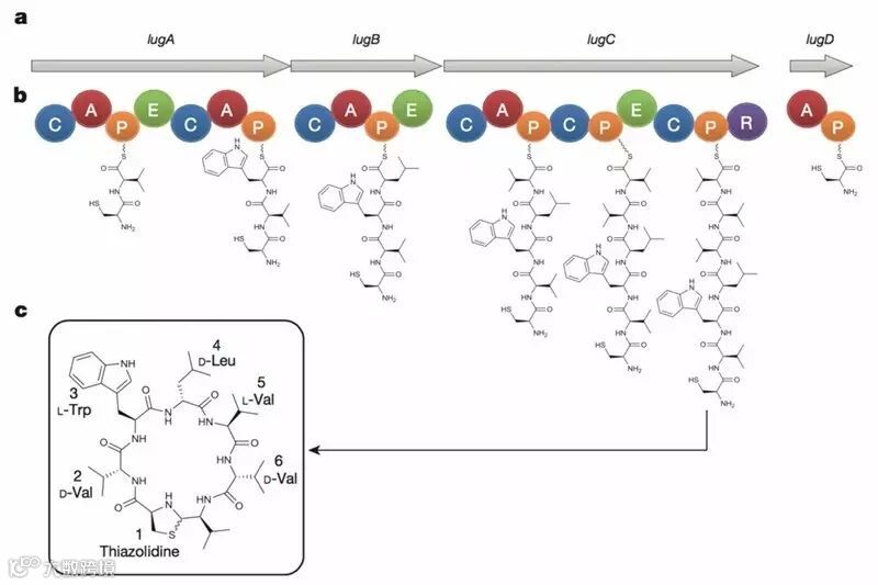 路邓素的结构式及可能的生物合成路线。图片来源:Nature