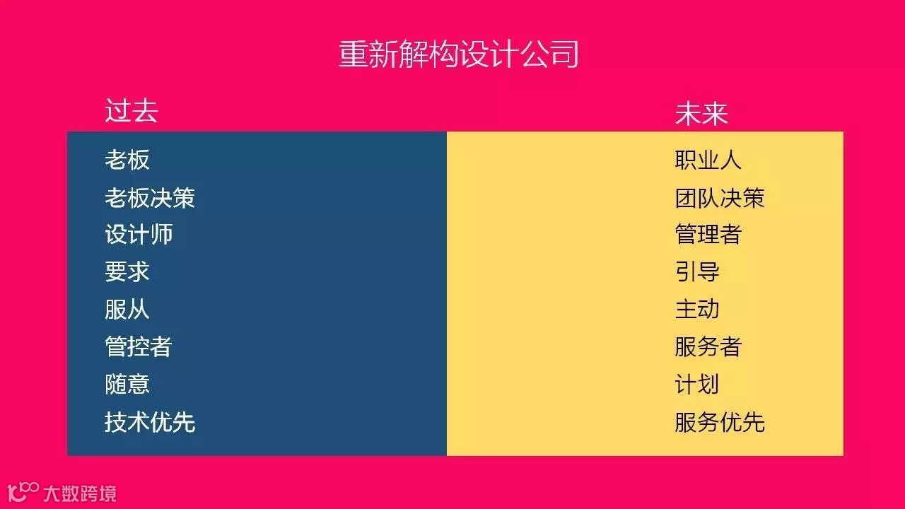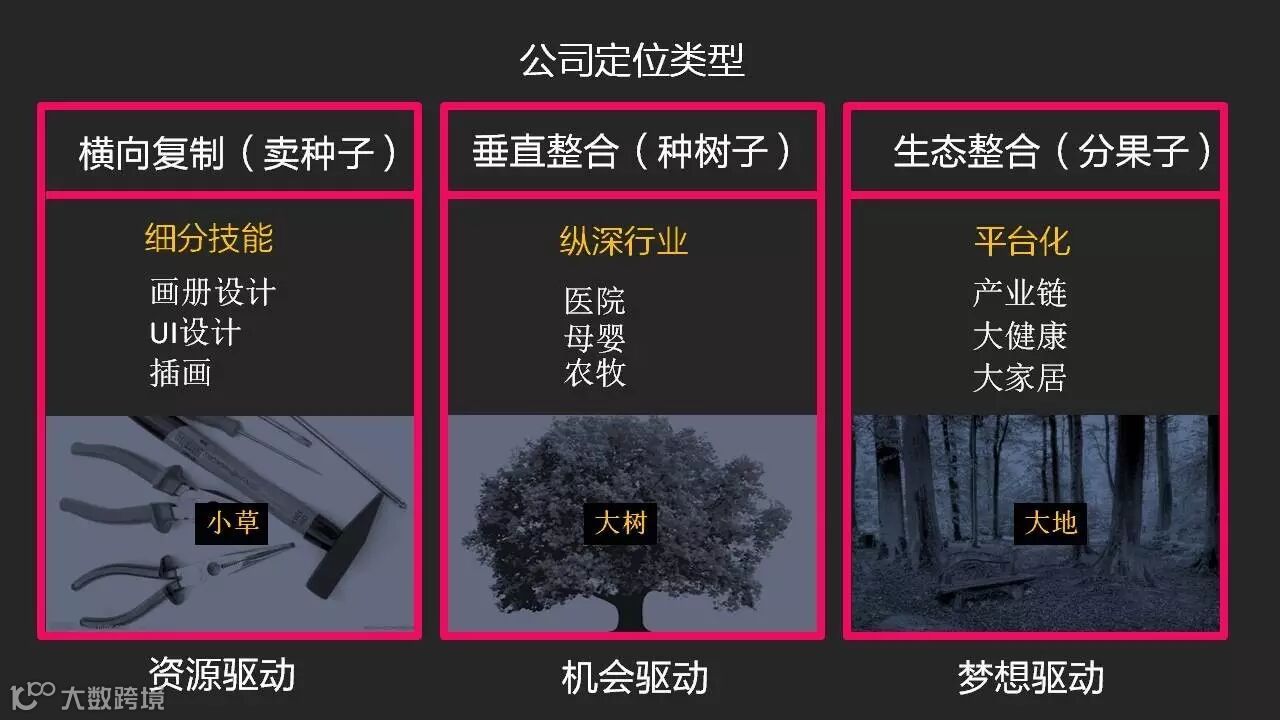 所以要做好一家设计公司首先是意识和角色的转变,同时搞清楚公司自身的定位和价值。从三个类型来看,每种定位都有自己的价值:卖种子就是打磨好单点能力,把细分技能优势放到最大不断复制;种树子就是深耕某个行业,纵深打通全产业链,扩大服务价值;分果子就是平台化运作,整合优势资源,抱团提升设计行业整体服务能力。