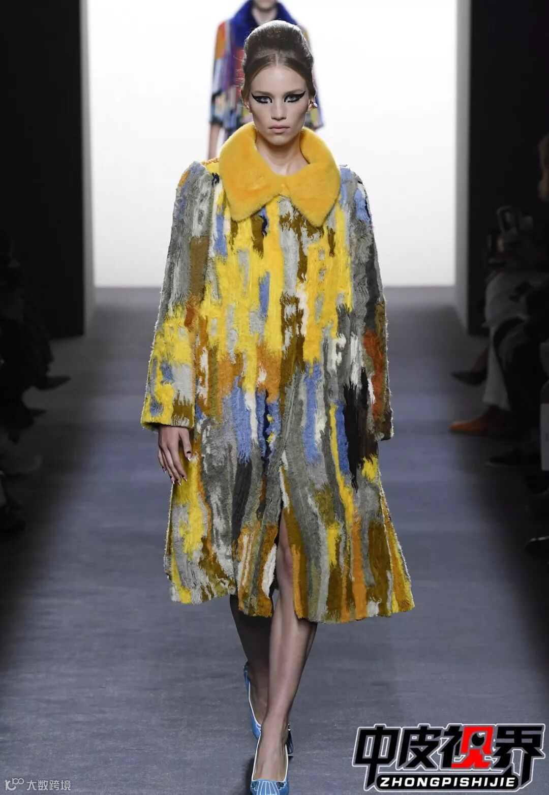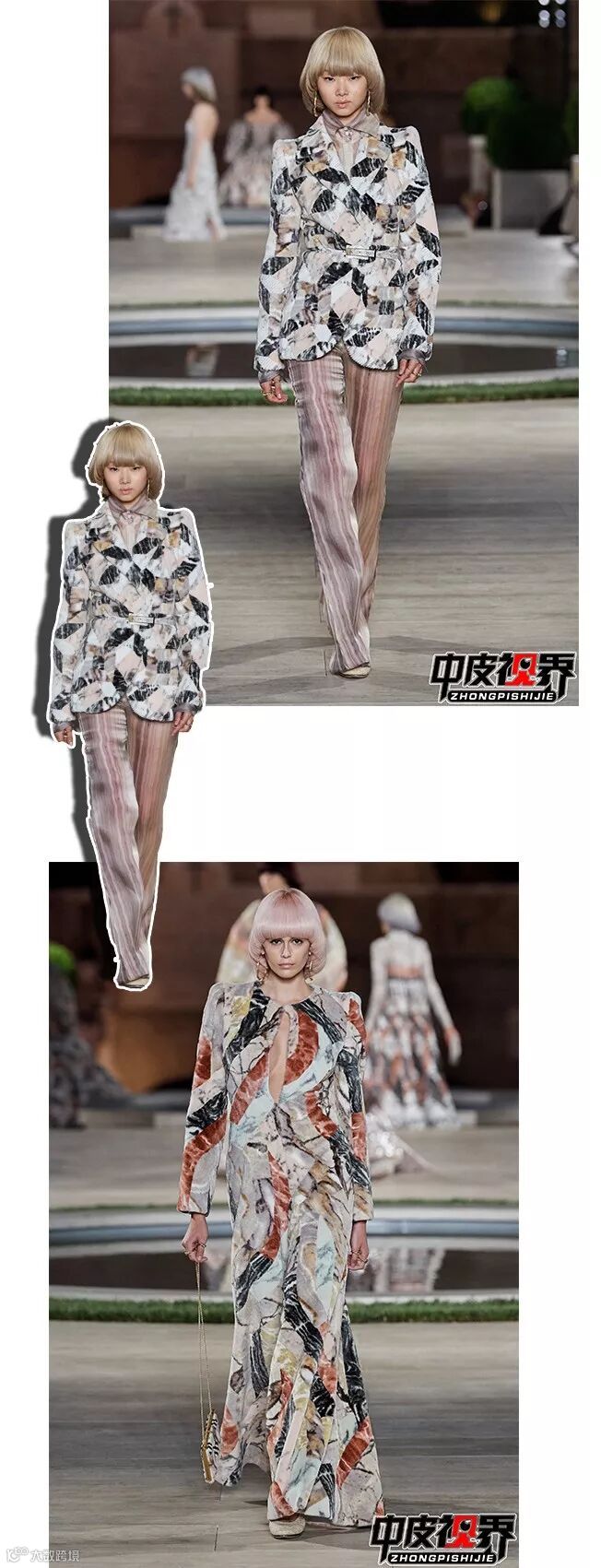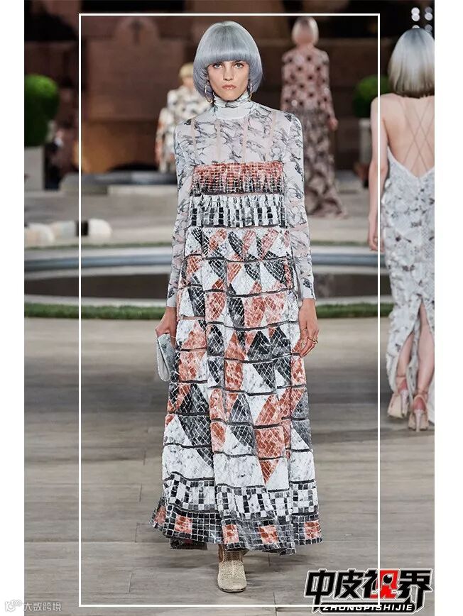 服装上仿佛流动着的大理石纹,给人以无限延伸的想象空间。与皮草的完美结合,时尚而温暖,厚重又不失绚烂。