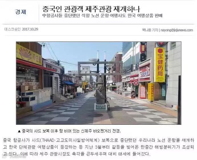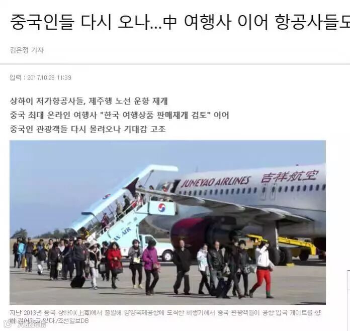 韩国主流媒体也大幅报道了关于中国禁韩令结束中国旅行团体游客开始光顾韩国济州岛。