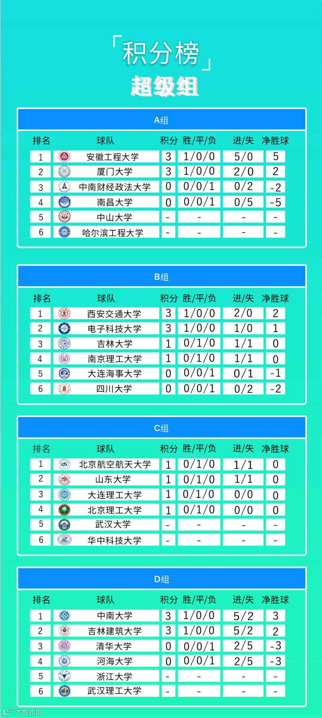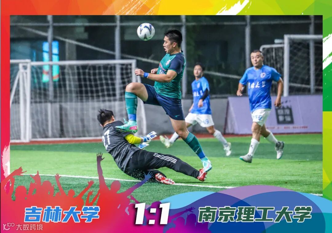 吉林大学携春季赛亚军的余威,本赛季再度出击,首场便和和南理工大打对攻,激烈对抗层出不穷,值得一提的是双方的门将表现都非常出色,高接低挡精彩扑救不断,比赛直到下半场后半段才被打破,吉林大学开出左侧角球被南理工队员混乱中挡进前门柱内侧,终场前两分钟南理工在前场右侧小角度射门打进球门右下角,双方最终握手言和,皆大欢喜。