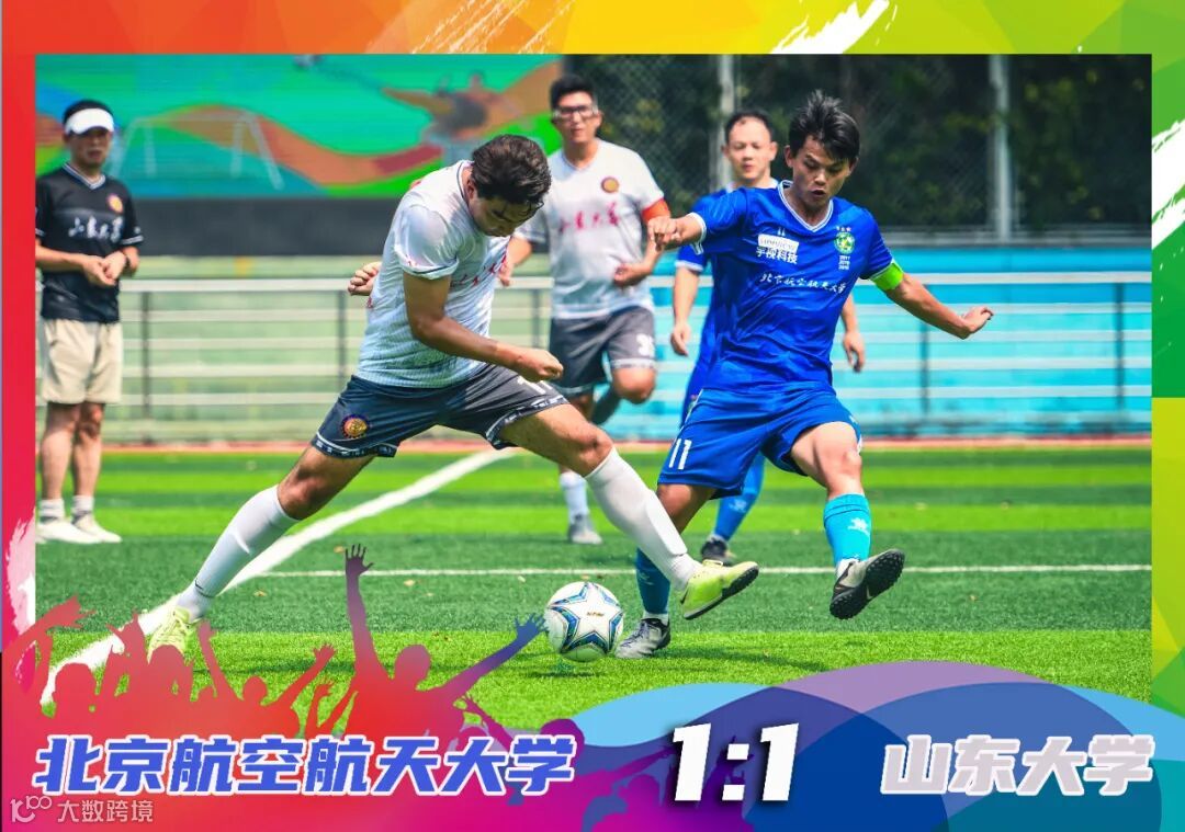 历来以作风顽强著称山东大学首轮就遇到了夺冠大热门北航,是一个不小的考验。然而北航今天球星缺阵,无法展现全部实力,第21分钟,北航形成攻势,两次射门被挡,但仍然利用机警的补射破门得分,仅仅过了几分钟,山大获得前场任意球,禁区内的队员高高跃起头球扳平比分,下半场,北航多次创造良机,但都被神勇的山大门将化解,最终双方1:1握手言和。
