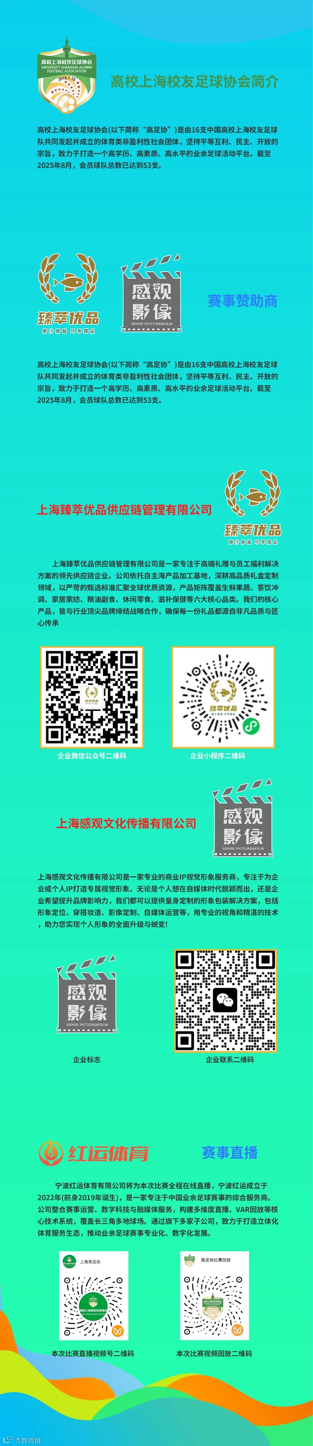 2025年9月7日,“臻萃优品杯”第十一届高校上海校友足球联赛超级组的赛事也重燃战火,地点依然是我们非常熟悉的金汇足球公园,代表高足协最顶级水平的24支队伍悉数亮相,为观众们奉献了一场场精彩的对决,不过,因为天气原因,部分场次未能完赛,将择日进行补赛,算是本轮的一个遗憾。