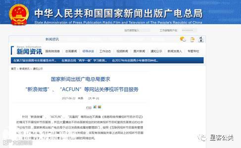 广电总局称“新浪”、“ACfun”、“凤凰网”等网站在不具备《信息网络传播视听节目许可证》的情况下开展视听节目服务,并且大量播放不符合国家规定的时政类视听节目和宣扬负面言论的社会评论性节目,国家新闻出版广电总局于近日发函责成属地管理部门,按照《互联网视听节目服务管理条例》(广电总局、信息产业部第56号令)的有关规定,采取有效措施关停上述网站上的视听节目服务,进行全面整改,为广大网民营造一个更加清朗的网络空间。