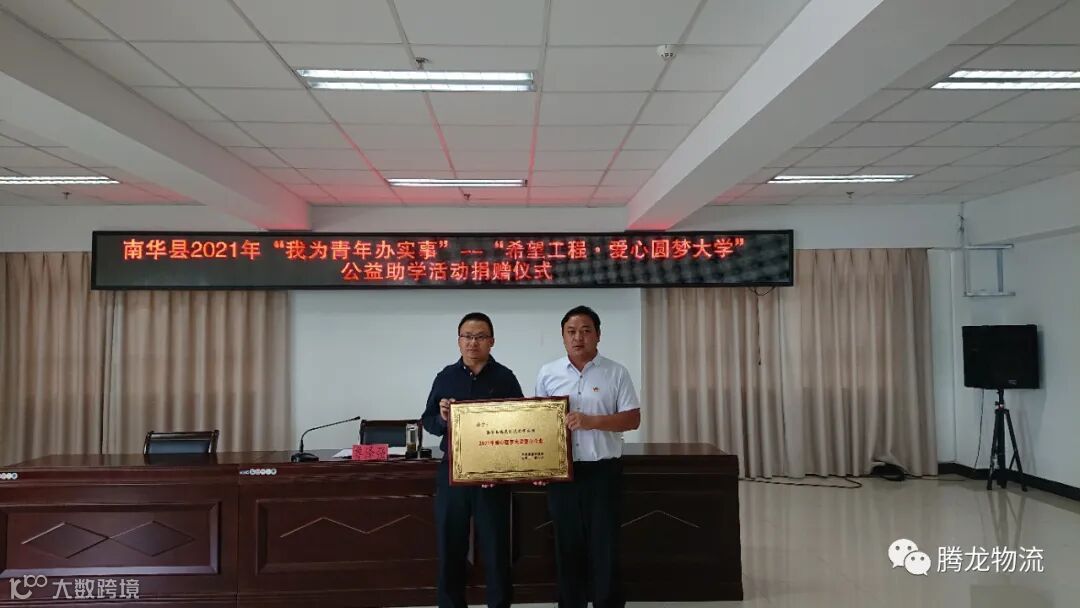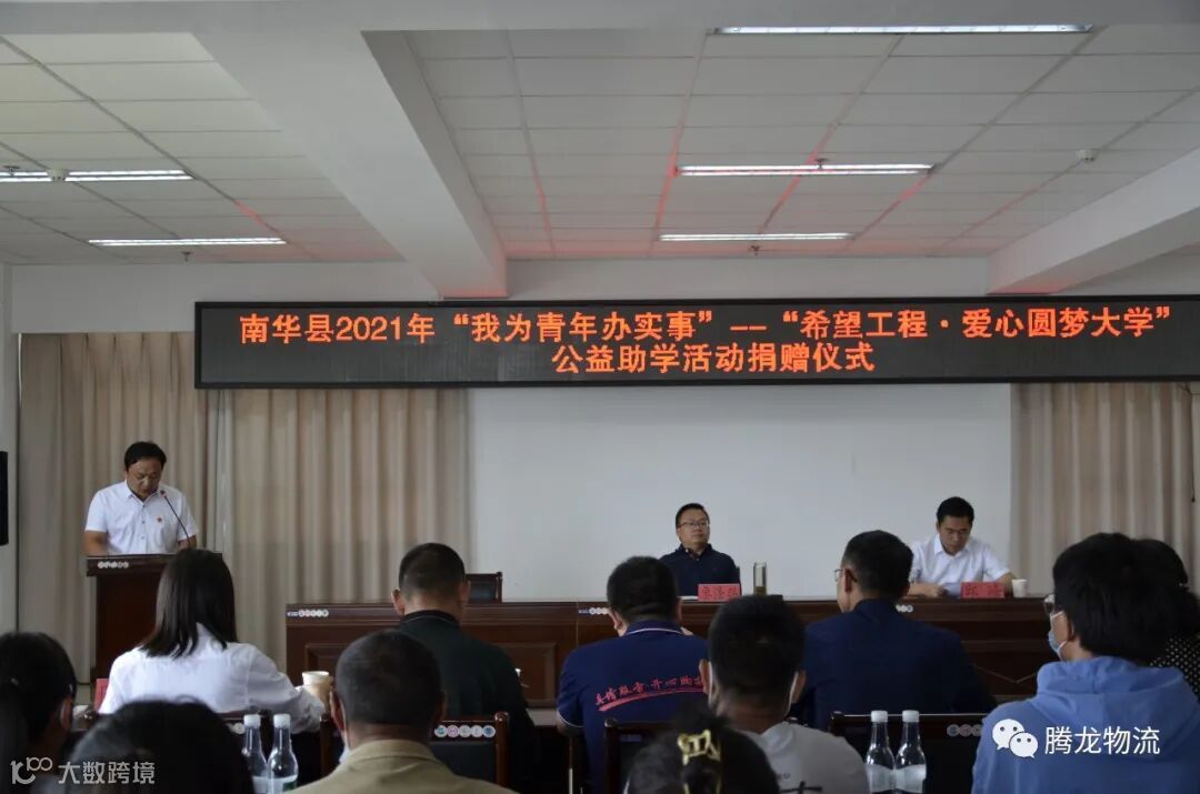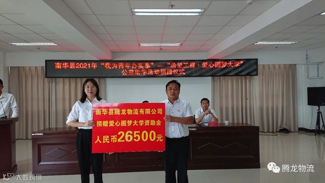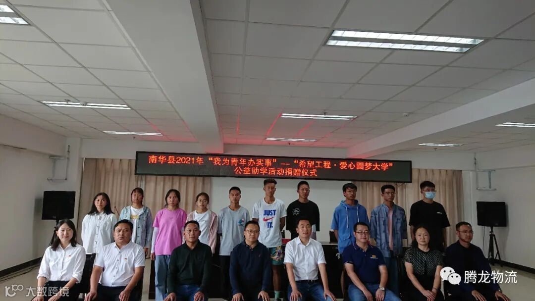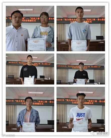 金秋八月,硕果累累。为聚焦“学党史、悟思想、办实事、开新局”目标,进一步深化“我为青年办实事”实践活动,南华县腾龙物流有限公司积极响应县委、县政府关于巩固拓展脱贫攻坚成果同乡村振兴有效衔接的号召,给南华县第一中学考入大学的13名优秀学生捐赠了26500元助学金,帮助家庭困难、品学兼优的学子实现大学梦想。2021年8月31日下午在南华县公务中心802会议室参加了公益助学活动捐赠仪式。