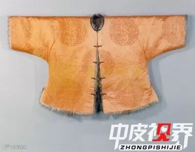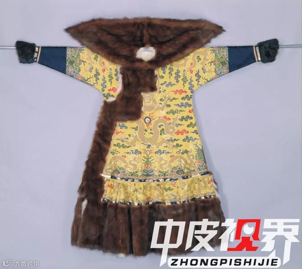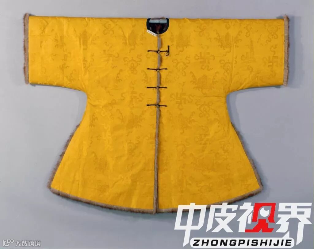 朝袍和端罩是皇帝在重大场合穿着的,在日常生活中,皇帝也是貂皮不离身。比如这件明黄色江山万代暗花绸貂皮褂。