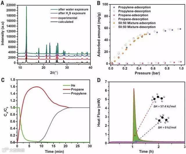 研究者们发现,这样的材料对丙烯与丙烷具有十分优异的选择吸附性。在温度为298 K,压力为1 bar的情况下,该材料仅对丙烯具有吸附性。为了进一步证实这一结果,他们测量了材料的吸附热,结果表明在仅有丙烷的情况下吸附热几乎为零。这种材料在水蒸气和H2S的氛围下依然能够保证稳定的结构。
