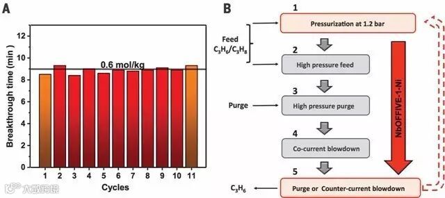 最后,他们展示了如何将这一材料应用于实际的分离过程之中。通过一个简单的“高压吸附-惰性气体清洗-低压脱附”循环能够实现丙烷/丙炔混合物(50/50)的有效分离。该材料能够反复利用并且在循环过程中(11次循环)吸附能力没有明显的下降。在浓度变化的吸-脱附循环中,经过8分钟吸附与10分钟脱附,丙烯的分离量可达~0.6 mol/kg,也就是说,这类吸附剂的分离效率约为每小时2 mol/kg。
