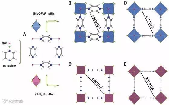 为了解决上述问题,Eddaoudi团队构建了一种氟化的金属有机框架(MOF)材料NbOFFIVE-1-Ni(也被称为KAUST-7)。首先,吡嗪与金属离子Ni2+首先形成方形的二维网格结构,然后再与氟化的无机柱配位,形成三维结构。通过改变柱子的形状、结构与性质,可以有效阻碍吡嗪的自由转动,从而改变MOF的最终孔径与最大的开口尺寸。