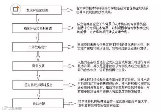 以色列大学科研成果转化模式具有模块化的特点,形成了一套完整的体系。下图详解了以色列高校成果转化的流程。