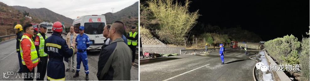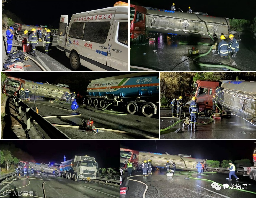 2021年4月5日15点17分,杭瑞高速公路昆明至楚雄方向K2333+500M(揽板凳隧道过1公里)发生交通事故。南华县腾龙物流有限公司危险品应急救援大队接救援电话后立即启动危化品安全事故应急救援预案,迅速组织救援车辆、人员和救援物资赶赴事故现场。 18点27分应急救援大队到达现场。