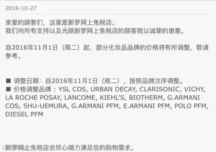 11.1起化妆品品牌全面涨价,包含品牌有:ysl伊夫圣罗兰,阿玛尼,娇韵诗,薇姿,理肤泉,兰蔻,科颜氏,碧欧泉,植村秀等