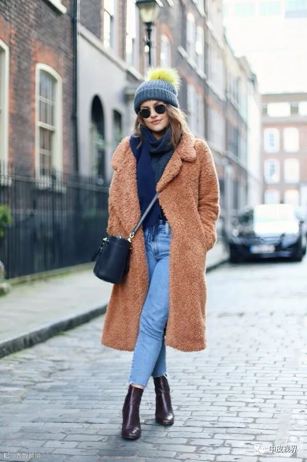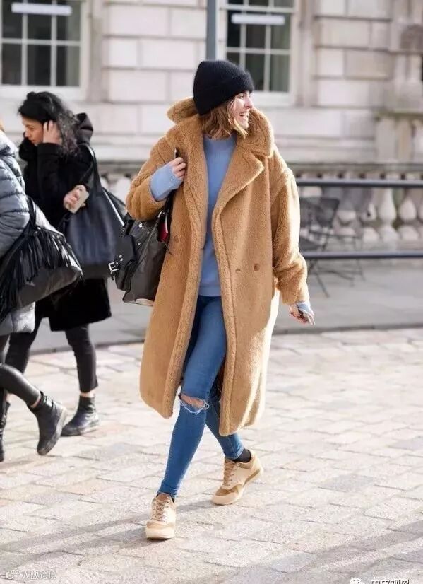 棕色的泰迪熊外套搭配蓝色牛仔裤来穿的话,棕色和蓝色形成对比色,打造视觉冲击感,而且牛仔面料独有的丹宁风能让你看起来更年轻休闲,为整身造型住了随性的味道。