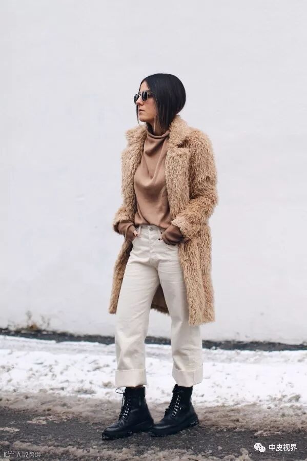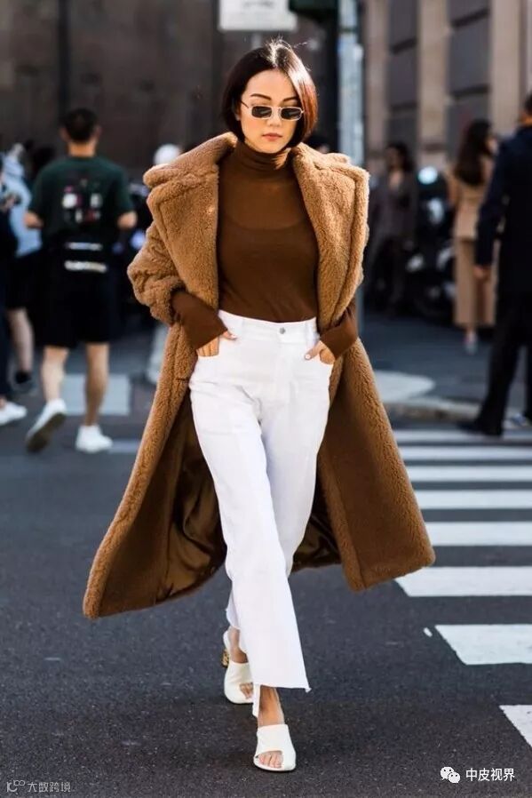泰迪熊外套搭配白色也是不错的选择,棕色和白色搭配起来最有气质,白色的优雅让你看起来更知性,而且可以提亮整个色调。