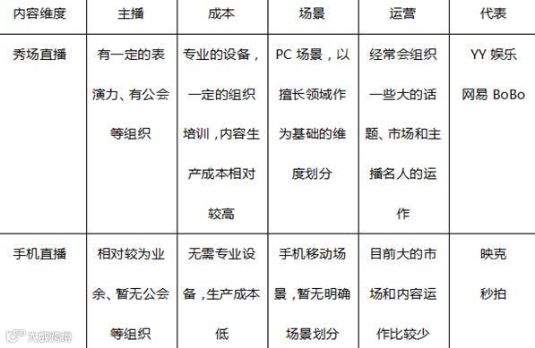 一般秀场内容的体系,主要由主播、成本、场景和运营这么几个因素构成。下面表格大概的裂了一下秀场直播和手机直播在内容体系方面的差异。秀场从出现到现在差不多有10年之久的时间,目前也基本进入一个专业化运作的稳定成熟时期,尽管目前看从媒体的角度而言要优于手机直播,未来手机直播和移动秀场走向融合。
