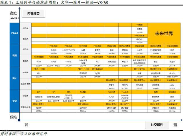 文字:大众领域,从1.0版本(门户)到2.0版本(论坛社区)到3.0版本(微博/微信),不断迭代、演进;垂直领域,文学、美食、体育、旅游等各种主题都经历了从1.0到2.0到3.0的互联网平台演进历程。