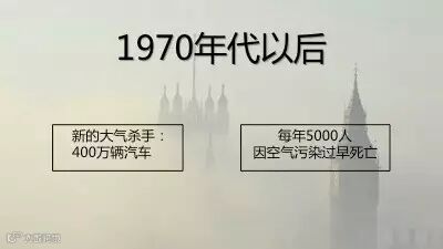 1952年12月5日到9日,由于冬季燃煤、工业排放量大,加上持续几天的逆温,二氧化硫、烟尘等颗粒物聚集在伦敦上空,这场雾霾导致约12000人丧生。