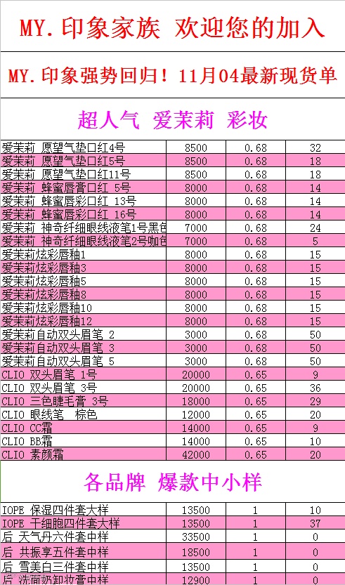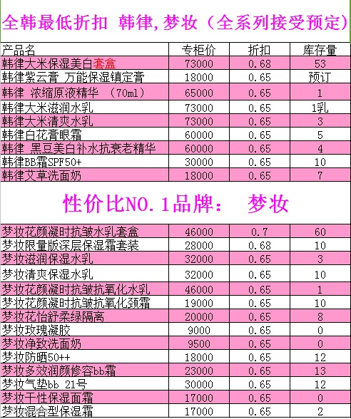 1、关注微信订阅号——myyinxiang520(my印象韩妆studio),回复数字一查看我们最新的现货折扣表。(刚关注微信不显示现货折扣表的亲,请查看历史消息,搜索便可。)