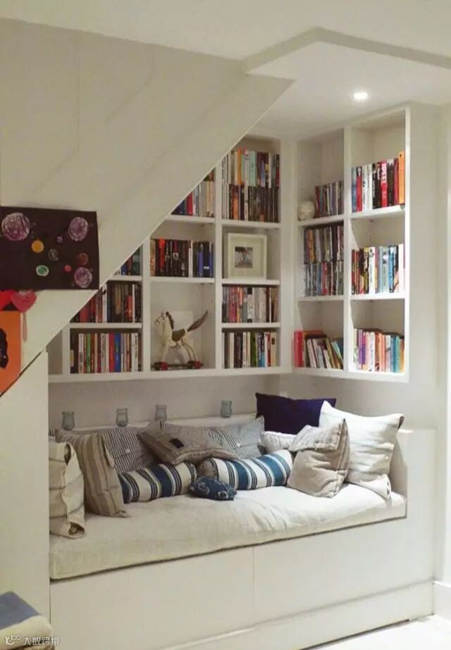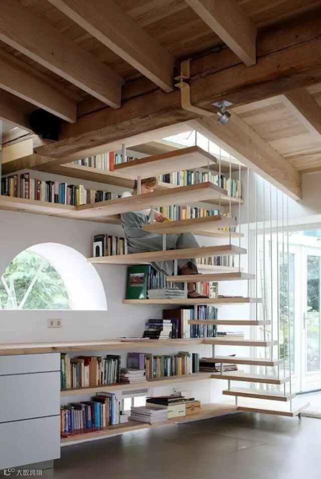 上下楼梯的空隙等各处都可以利用起来,不需要特别的梯子,楼梯也可以成为座椅。