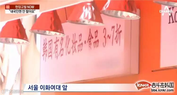 首尔梨花女子大学附近的某化妆品店门口写有“以不到一半的价格可买到韩国知名品牌产品”的字样。因为价格低廉,店内挤满了前来购物的中国人。部分韩国人想在此购物,但销售员以“这里为外国人专用卖场”为由,拒绝向韩国人出售商品。