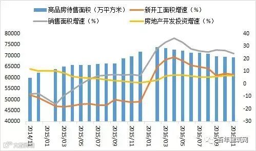 2016年1-11月份,全国房地产开发投资93387亿元,同比名义增长6.5%,增速比1-10月份回落0.1个百分点,比前三季度提高0.7个百分点。商品房销售面积135829万平方米,同比增长24.3%,增速比1-10月份回落2.5个百分点,比前三季度回落2.6个百分点。商品房销售额102503亿元,增长37.5%,增速回落3.7个百分点,比前三季度回落3.8个百分点。今年以来,房地产投资在政策利好及货币宽松等因素助力下实现超预期反弹,前期需求得到快速释放,销售面积和销售额一直保持较高增速,年末受多地楼市严控政策影响增速有所放缓。同时,房地产去库存效果明显,截止11月末,商品房待售面积69095万平方米,比10月末减少427万平方米,已连续9个月下降。