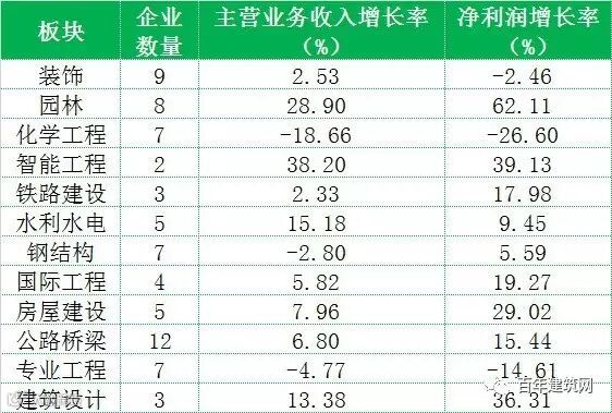 百年建筑网观察的72家上市建企2016年前三季度共同实现净利润总额815.90亿元,同比增长15.41%,较二季度扩大5.78个百分点。其中,园林板块净利润增幅62.11%排名首位,较二季度大幅提升40个百分点;智能工程、建筑设计净利润增幅分别为39.13%和36.31%排名二、三。