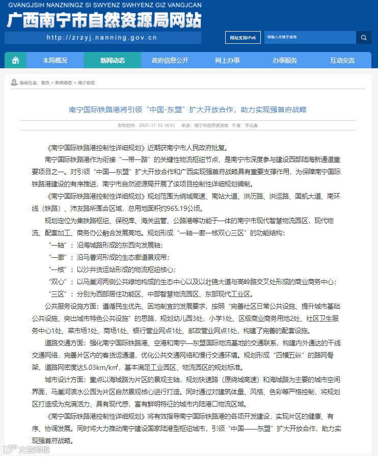 11月12日从广西南宁市自然资源局网站获悉,《南宁国际铁路港控制性详细规划》近期获南宁市人民政府批复。南宁国际铁路港将打造成为现代智慧物流园区,规划涉及1.45万亩,不仅对引领“中国—东盟”扩大开放合作和广西实现强首府战略具有重要支撑作用,也给沙井板块带来公共服务设施、道路交通城市设计等方面的诸多利好。