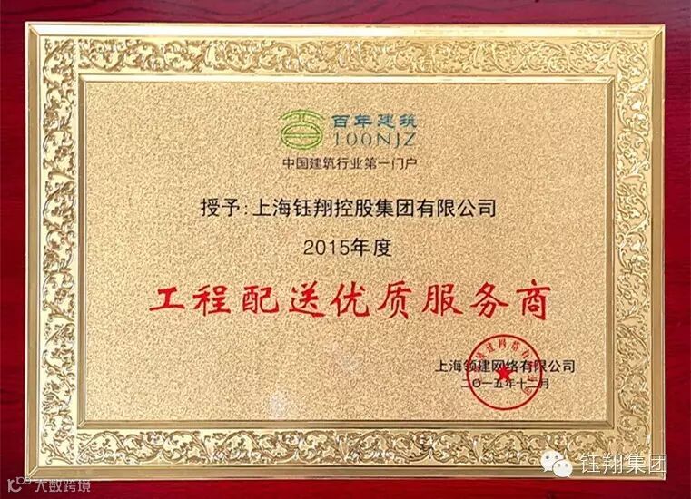 近日,集团荣获百年建筑网“2015年工程配送优质服务商”荣誉称号。此次获奖,代表了百年建筑网以及众多施工企业对集团31年来在工程配送上坚持提供优质服务的认可,集团将继续提高服务水平,为广大客户提供更优质的服务。