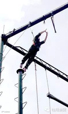 下午,我的身体状况明显有了好转,于是我跟着大家来到第三个拓展项目的场地。在这里伫立着一根十米高的铁柱,柱身嵌有脚踏环,柱身的顶端是一个只能容下一双脚的圆形铁盘。根据教练的讲解,我们今天的任务就是在有绳索保护的情况下,徒手攀上十米铁柱的顶端,然后站在圆盘上,转向悬挂着横杆的一侧,纵身一跃去抓住横杆,然后放手降落。这一个项目可把有恐高症的同事们吓的牙齿打颤,十米高台,铁柱难免会有所晃动,就算是七尺男儿也会面露惧色。我们的新同事宝哥身先士卒,勇敢的登上高台,完成了他完美的第一跃,我们这些观众一起为刚落地的勇士拍手称赞。经过这次的鼓舞,男队员们终于按捺不住那自我挑战的心,争先恐后地排起了队伍。其中让我印象最深刻的就是我们的许会计了,在我看来,以他的身形要完整的完成这个项目极有难度,我们默默地望着他,为他加油。可令我们万万没想到的是,他利用后背的绳索来保持平衡,最后站在了圆盘上,大家为他喝彩。我是女士中第一个尝试攀爬的挑战者,攀爬的过程,一方面消耗大量的体力,一方面承受着高处的恐慌,但是听到了同事们的鼓励和加油,我便鼓起勇气很快攀登到顶端。在我正准备踏上圆盘时才发现,最后跨上圆盘才是真正的大难题,我想到了许会计的攀登妙计,我也尝试着效法,最终站在了圆盘之上,可惜,就在那纵身一跃的刹那我没有抓到铁杆变成了自由落体,当时葛总把我纵身一跃的身姿用相机定格了下来,至今看到这张照片我仍然为自己的勇气所感动。