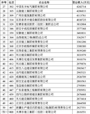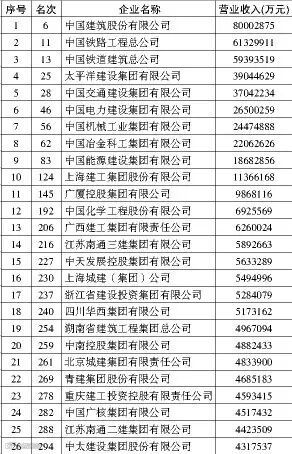 《建筑时报》报讯 2015中国500强企业高峰论坛8月22日在广西南宁市隆重举行。在论坛上,中国企业联合会、中国企业家协会共同发布了2015年中国企业500强榜单。中石化以28899.3429亿元的营业额连续第十一年排名榜首。记者从榜单上了解到,业内共有51家承包商入围中国企业500强,比去年增加3家(见表)。其中,中国建筑股份有限公司以8000.2875亿元位列中国500强企业第6名,是业内入围企业中唯一进入榜单前十强的承包商。