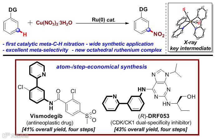 近日,中国科学院上海药物研究所张翱研究组首次报道了过渡金属催化的苯环间位直接C-H键硝基化反应,他们采用十二羰基合钌作为金属催化剂,以三水合硝酸铜作为硝化试剂,化学专一性地在苯环的间位进行精准的硝基化。机理研究发现零价钌在催化过程中形成了18电子的八面体钌复合物活性中间体,并在邻位形成Ru-C键,继而选择性地在间位进行亲电取代反应,从而实现间位硝基化过程。