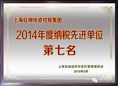 2015年5月,崇明县富盛经济开发区对2014年园区严格遵守国家税收法律法规,依法诚信纳税,积极配合税务部门做好税收征管工作的企业进行了表彰,钰翔集团荣获“2014年度纳税先进单位第七名”荣誉称号。