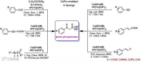 最近,华侨大学化工学院新一代物质转化研究所的宋秋玲教授结合该课题组已经开发的Cu/O2体系的独特催化活性,利用价廉易得的原料,在Fe盐与Cu盐的协同催化下,通过产生氧自由基以及磷中心自由基,开发出一系列制备β-羰基磷酸酯的高效新方法:(1)从苯乙炔衍生物出发,利用自由基,将C-C三键通过双官能团化一步转化成β-羰基磷酸酯;有趣的是将该反应条件运用到苯并炔酸衍生物时,可以同样高效地得到β-羰基磷酸酯,这两项成果发表在《Org. Lett.》(2015, 17, 1786-1789)上。(2)苯甲醛类化合物是一类价廉、易得、应用广泛的有机化合物,他们被用到很多的有趣的多米诺(一锅法)反应中。众所周知,苯甲醛可以通过Knoevenagel反应容易地得到苯丙烯酸;基于以上的事实,该课题组发展了一个苯甲醛和亚磷酸酯参与的自由基诱导的多米诺Knoevenagel脱羧羰基磷酸酯化反应。这项成果与苯丙烯酸的结果一起发表在《Chem.-Eur. J.》(2015, 21, 10654-10659)上。(3)在进一步的研究中,该课题组发现肉桂酸酯或者肉桂酰胺类化合物在适当的条件下也可以在自由基诱导下发生不饱和键的双官能团化,通过C-C键的选择性切断以及C-C双键的活化,一步制备β-羰基磷酸酯(RSC Advances 2015, 5, 103977-103981)。(4)在利用α,β-不饱和酮进行反应的时候,该课题组发现产物的生成受到与羰基相连的取代基以及与不饱和碳键相连的取代基的影响,进而在自由基的诱导下选择性的切断C(C=O)-C单键或者碳碳不饱和键。该项成果发表在《J. Org. Chem.》(2016, 81, 10.1021/acs.joc.5b02887)上。
