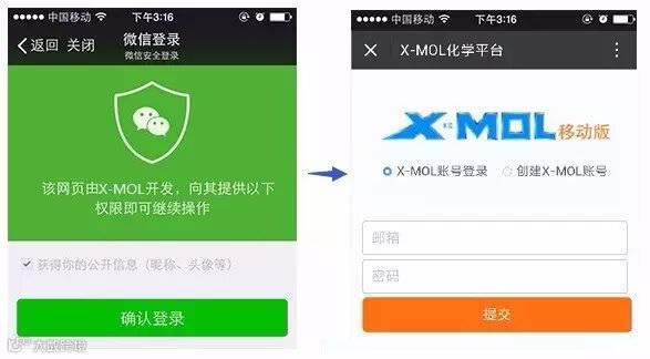 该功能需要登录,如果没有在微信端登录过,会有一个授权页面,确认后再登录X-MOL,系统就会把您的微信号和X-MOL账号关联起来,这样以后您就不用每次都输入用户名和密码了。