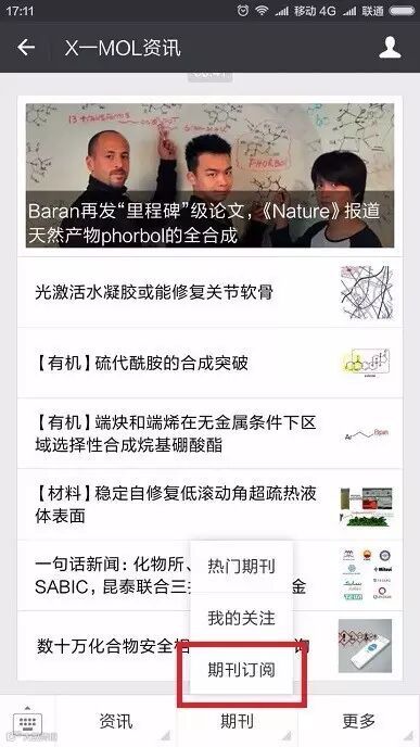 手机微信订阅号中点击“X-MOL资讯”,下方的菜单,找到“期刊订阅”,点击进入即可。