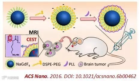 近期,中国科学院上海硅酸盐研究所倪大龙在步文博教授的指导下,与复旦大学附属华山医院和汕头大学医学院第二附属医院紧密合作,借助于核壳结构设计,将聚赖氨酸(PLL)组装到超小NaGdF4纳米颗粒表面,制备出NaGdF4@PLL新型造影剂。这种简便的核壳结构可以将磁共振T1-加权成像和化学交换饱和位移(CEST)成像高效融为一体,其中,内核NaGdF4弛豫率高达6.42 mM-1s-1,高于目前临床常用的钆剂(~3.8 mM-1s-1),且具有更长的血液半衰期,更长的成像时间,可以实现T1-加权造影成像,用于肿瘤病灶区的精准影像定位;外层PLL具有CEST效应,这种效应对pH敏感,可以用于实时监控肿瘤病灶区pH变化,为肿瘤分级提供病理信息。他们选取实验鼠原位脑胶质瘤模型,在单一磁共振仪器上实现了脑胶质瘤灶区结构影像与功能影像的同机融合,这类新型的双模态造影剂赋予病灶区影像兼具精细的解剖结构和高敏感性功能信息的独特优势,真正做到脑胶质瘤的精准影像诊断和病理变化(pH)的实时监控,极具临床应用潜力。