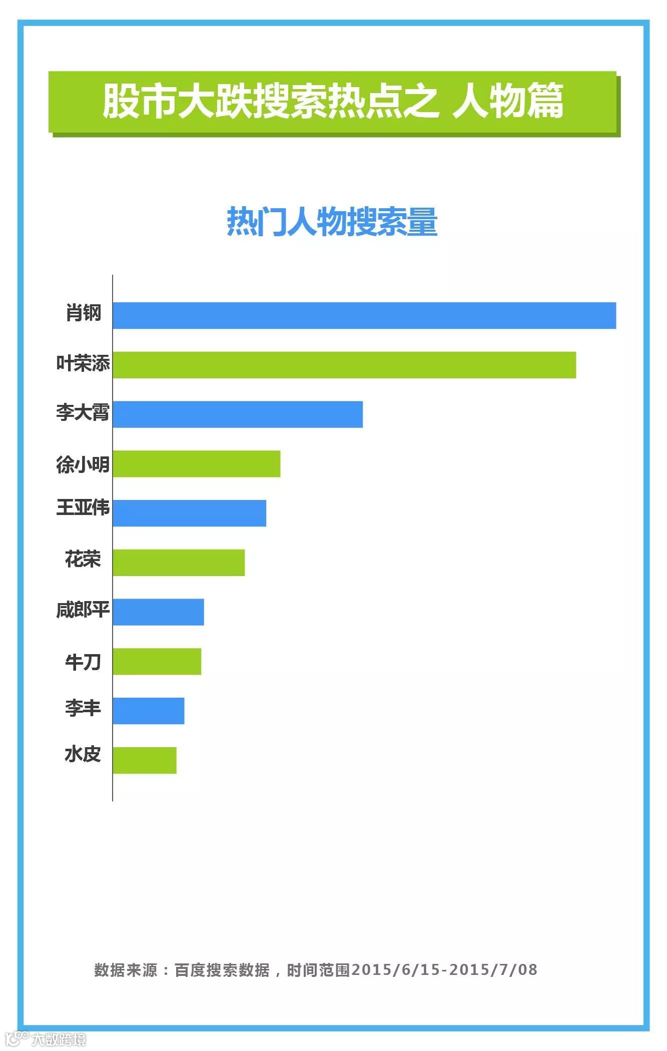 在6月中旬这次股灾来临时,绝望之际你最想抱“谁的腿”?证监会?财政部?还是忽悠着5000点是牛市开端的行业专家?数据显示,肖刚、叶荣添、李大霄、徐小明成为网民搜索排名前四位的四大“人气天王”。此外,牛刀、王亚伟、华荣、郎咸平等专家学者也榜上有名。从该指数可以看到,在股灾中,股民首先还是期待“官方机构”解救自己,其次则是专家学者。