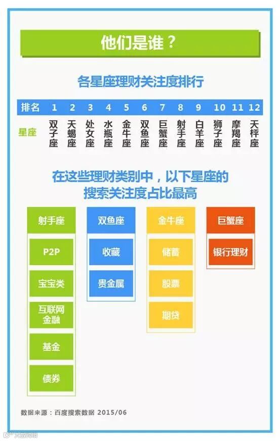 你以为金牛座是稳健扎实的“保守派”么,大数据告诉你这可能是一种想当然。百度根据搜索引擎上的数据得到,金牛座最关注的理财品种竟然是股票和期货。热血飞扬的射手座理财偏好上则非常博爱,p2p、基金、宝宝类都是他们热衷的理财品种。而艺术气质浓厚的双鱼座则更关注收藏和贵金属投资。居家沉稳的巨蟹座理财风格也较为保守,更青睐银行理财。