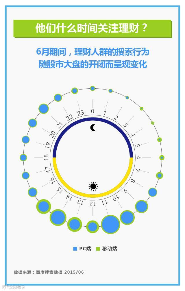 报告显示,理财人群的搜索行为虽股市大盘的开闭呈现变化。早9点到下午3点为一天中理财的集中时段,11点、14点和10点依次为理财搜索的峰值时间。老板们还以为这是工作的员工工作的“黄金时间”么?建议可以根据百度大数据的追踪结果重新制定一下工作计划表!