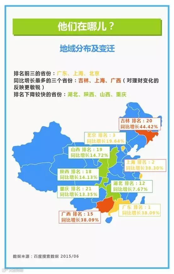 从地域分布看,广东、上海和北京是互联网理财需求最旺盛的区域。不难看出,沿海省份和发达城市的居民显然拥有更充足的理财资产和更与时俱进理财观念。而在过去一年中,广西、上海和吉林的排名上升最快,对理财热潮的反应最为敏锐,这也显示出发达地区和相对发展滞后地区理财需求皆在稳步上升,也反应出互联网理财“全民化”发展的趋势。