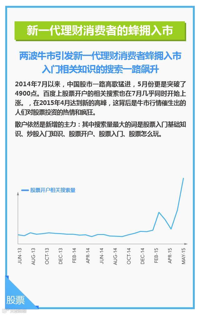 再来看右图数据,2014年7月以来,中国股市进入牛市通道,2015年4月起进入“疯牛”节奏,5月突破4900点。在百度上对“股票开户”一词的相关搜索也在2014年7月几乎同时开始上涨,一直到2015年4月达到新的高峰,这背后是牛市行情催生出的人们对股票投资的热情和疯狂。