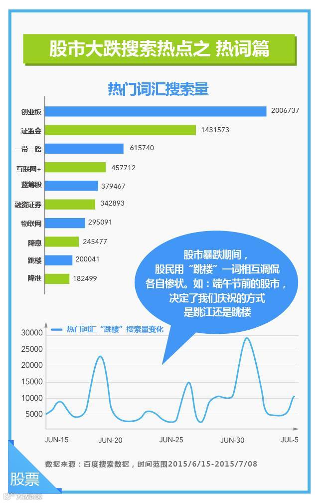想知道股市跌的有多惨,去问问百度大数据。“跳楼”一词进入了股灾期间网民热搜关键词TOP10,明白大家都在想什么了么?还记得“端午节前的股市,决定了我们的庆祝方式是跳江还是跳楼”这样的调侃么。现在看来,跳楼一词的搜索量激增,绝对反应出股灾的凶险程度和股民的心态变化。