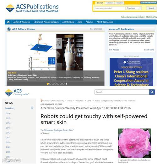 自文章刊发以来,该成果受到了美国化学会的重点推荐,得到了国际同行的广泛认可。美国化学会将该项成果选作“ACS Editors’ Choice”在其主页进行重点报道,并将上述文章开放获取以利于其广泛传播。同时,美国化学会官方的PressPac以“Robots could get touchy with self-powered smart skin” 为题,对该项工作撰写了专门的新闻稿进行推荐。与此同时,该项工作还受到了国际新闻媒体的广泛关注,多家媒体进行了详细的报道。
