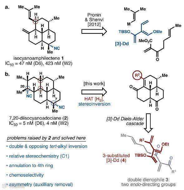 故事要回到2012年,Shenvi组用Danishefsky dendralene [3-Dd](无环分支多烯)经过多次分子内DA反应构建isocyanoamphilectene母核。大家都知道,DA反应由于能够顺速构建分子复杂性在全合成中有着极为重要的地位(小编私以为是自然界中最美的有机反应之一,堪比武林中的降龙十八掌),所以Shenvi组理所当然的想到这个策略能不能用到7,20-diisocyanoadociane的全合成。对比两个化合物可知:1)后者有两个不同朝向(水平和垂直)的季碳异腈基团;2)C1位H朝向相反;3)环个数增至四个;4)如何选择路线保证最小FGIs(官能团转化);5)如何从双烯3和分支烯4出发保持相对和绝对立体选择性。