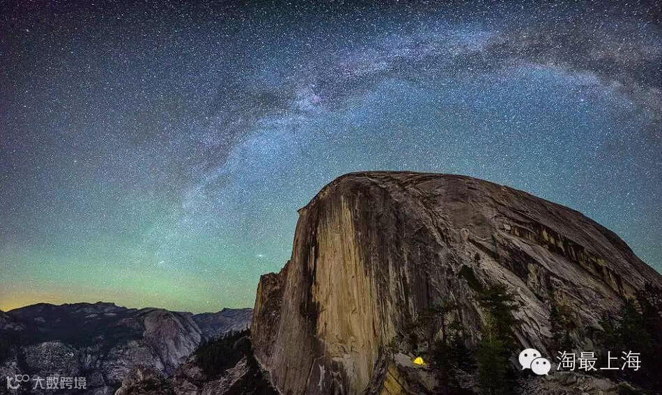 大自然的美景像是一首诗。在Diving Board露营,山腰处黄色灯光是登山者架起的帐篷。