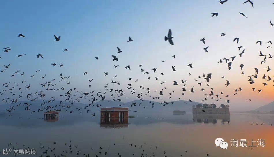 贾马尔湖面上的日出水宫殿的黎明。黎明时刻,印度水宫殿周围十分静谧,鲜有人出现,偶尔会有当地人来到湖边喂鱼和鸽子。这些鸽子不停在湖面上穿梭,摄影师按下快门一起将宫殿和飞鸽纳入镜头。